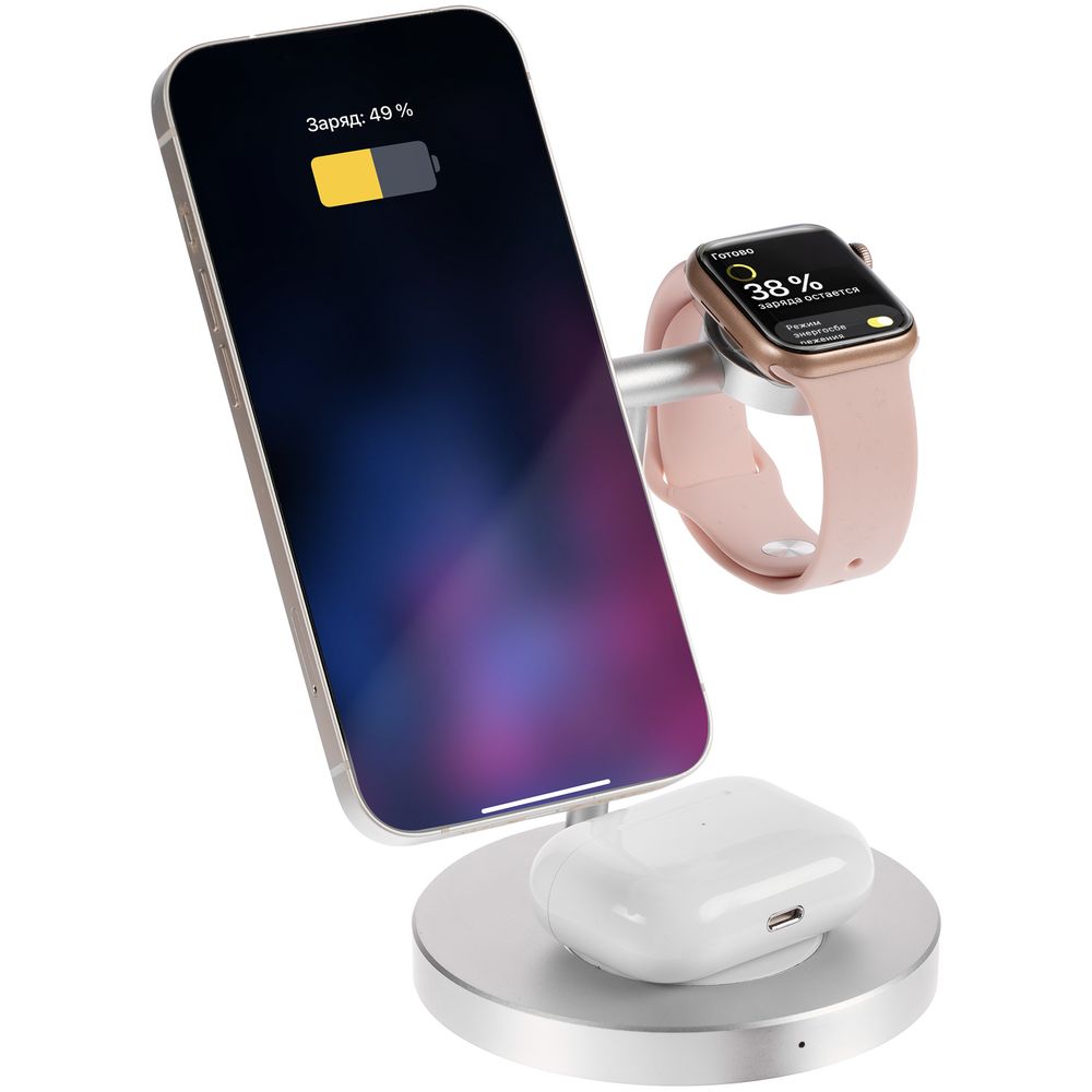 Станция может заряжать одновременно 3 устройства: беспроводные наушники с соответствующей функцией беспроводного заряда, смартфон, часы Apple Watch 2–8. Смартфоны iPhone 12–15 удерживаются на станции встроенными в их корпус магнитами. Прочие телефоны рекомендуем дополнить магнитным стикер-адаптером Magmate для надежного удержания на зарядной области.