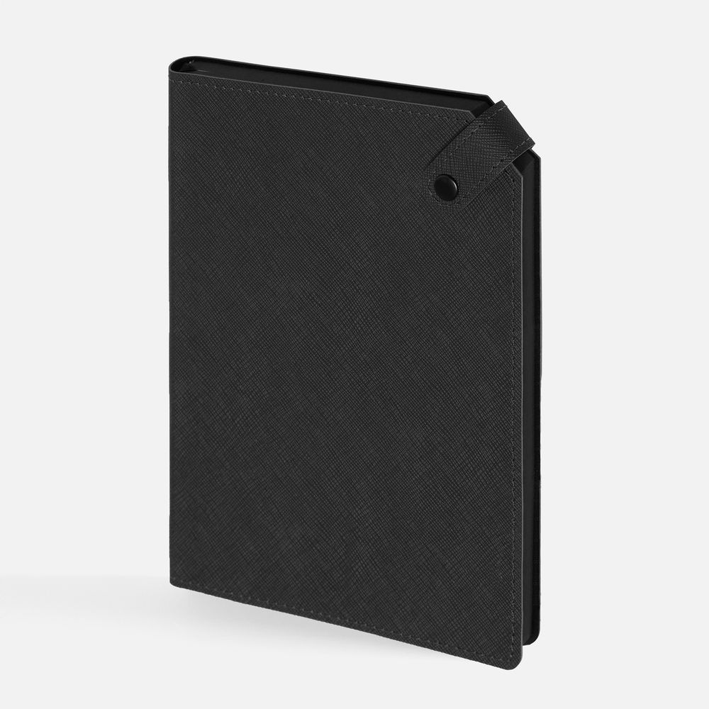 Ежедневник с гибкой обложкой, выполнен из материала Espresso, дополнен ляссе черного цвета и хлястиком на кнопке.