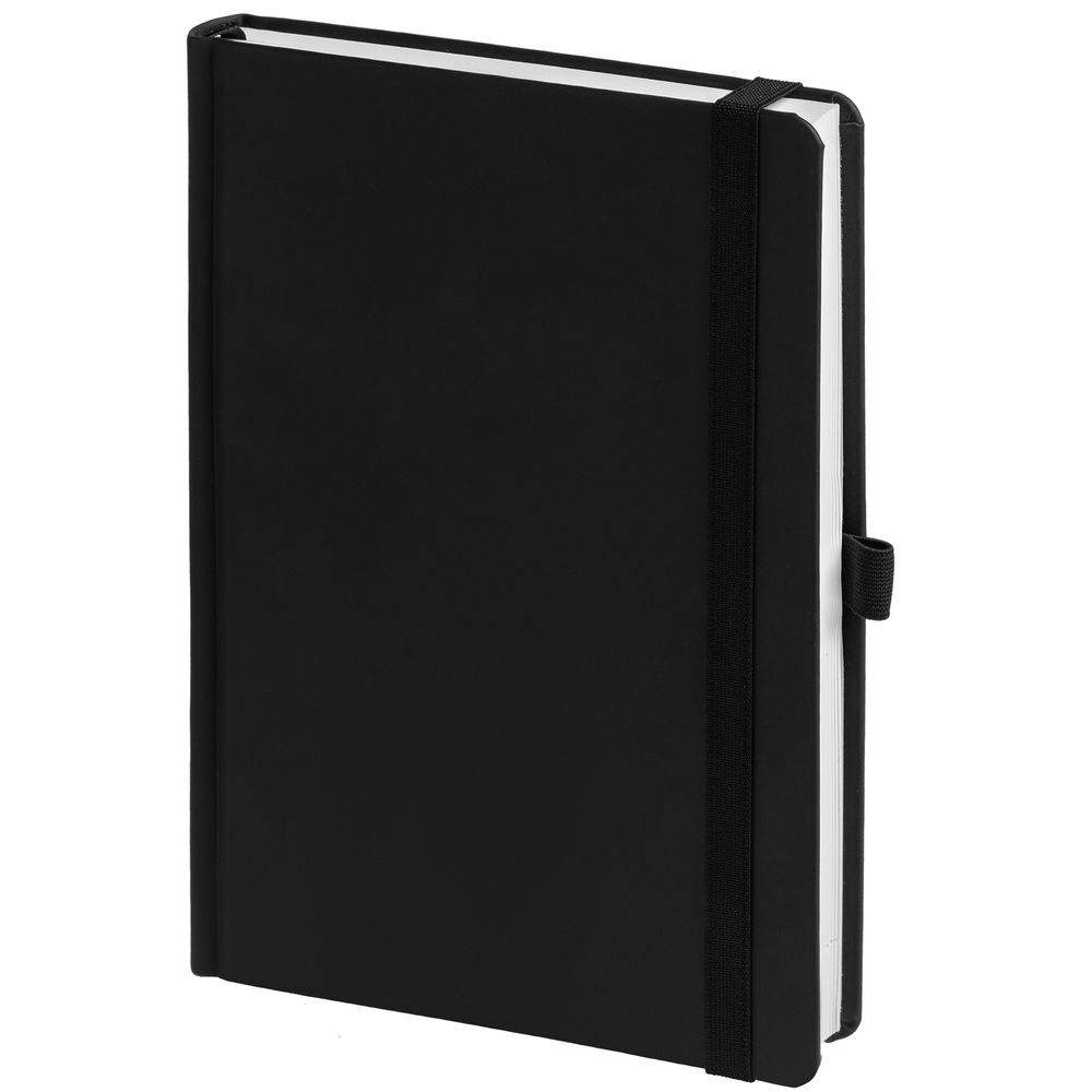 Ежедневник с твердой обложкой без поролона, выполнен из материала Soft Touch, черный АА, дополнен резинкой шириной 1 см, петлей-резинкой для ручки, капталом и ляссе черного цвета.