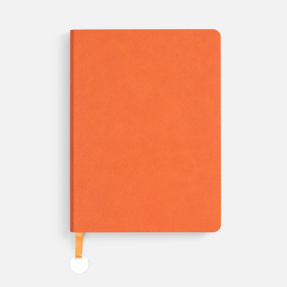 Ежедневник с гибкой обложкой, выполнен из материал La Fite, оранжевый ОО, дополнен ляссе в цвет обложки с металлическим шильдом.