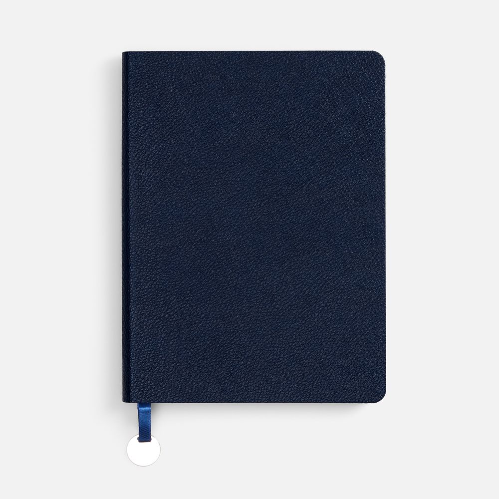 Ежедневник с гибкой обложкой, выполнен из материал La Fite, темно-синий ХХ, дополнен ляссе в цвет обложки с металлическим шильдом.