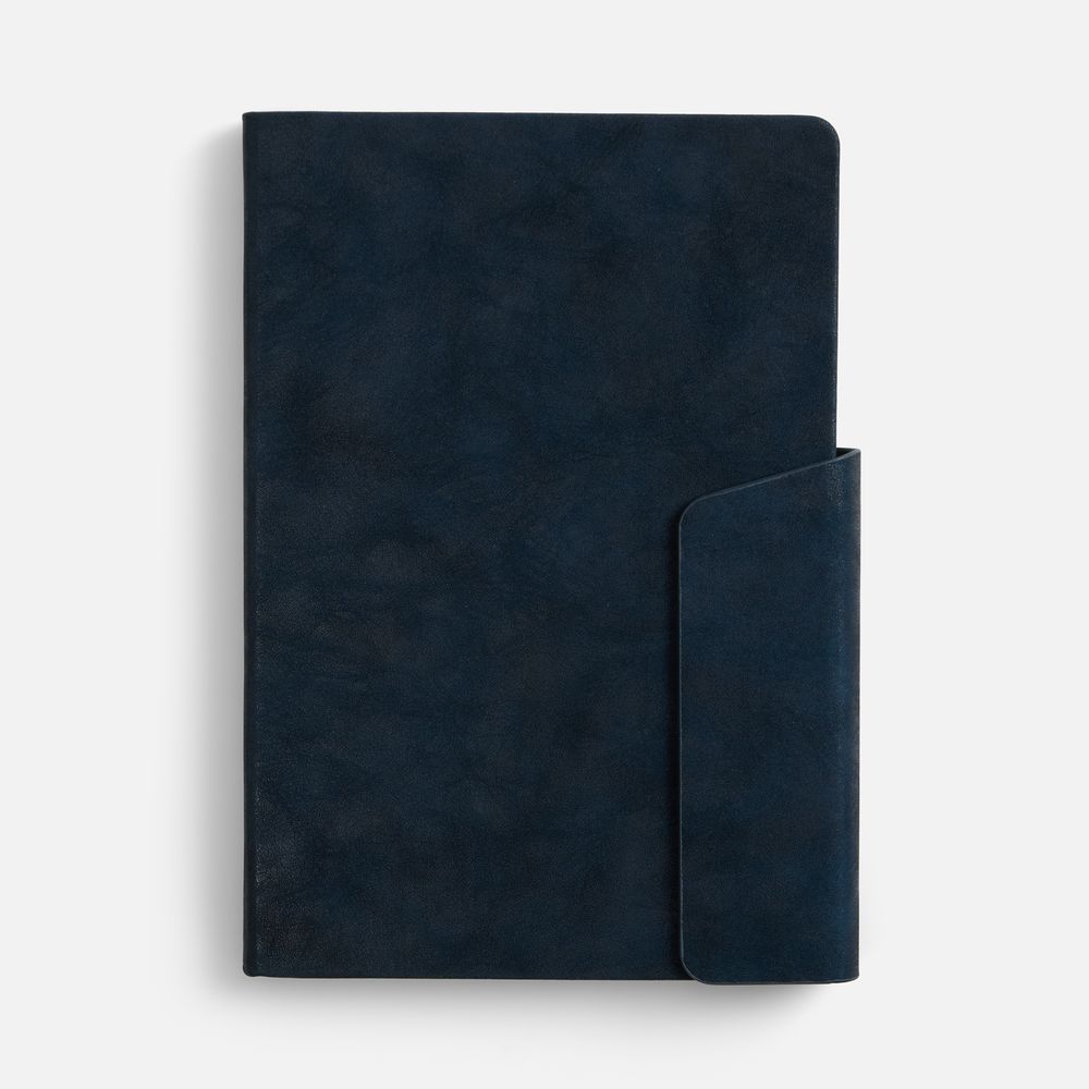 Ежедневник с твердой обложкой и фигурным магнитным клапаном, дополнен капталом и двойным ляссе.