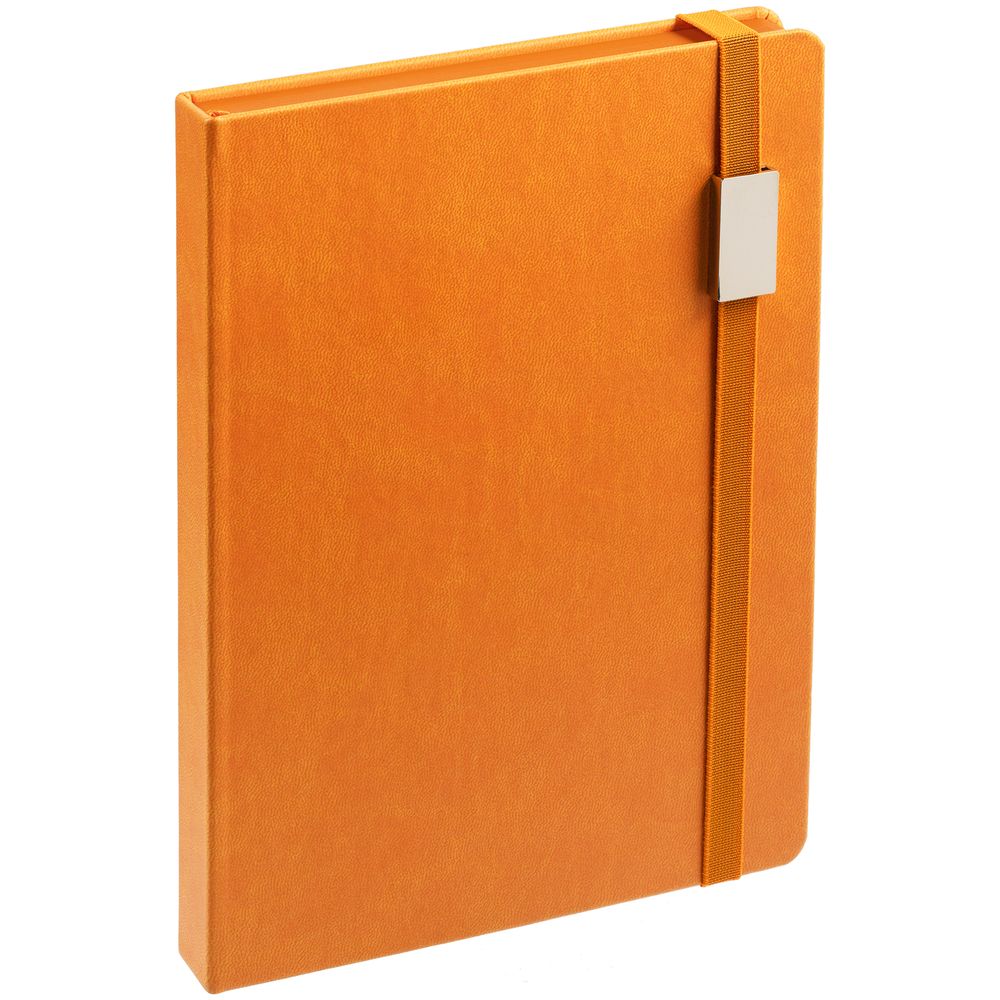 Ежедневник с твердой обложкой, выполнен из материала Latte, оранжевый ОО, обрез оранжевого цвета, дополнен ляссе оранжевого цвета и резинкой с металлическим шильдом.