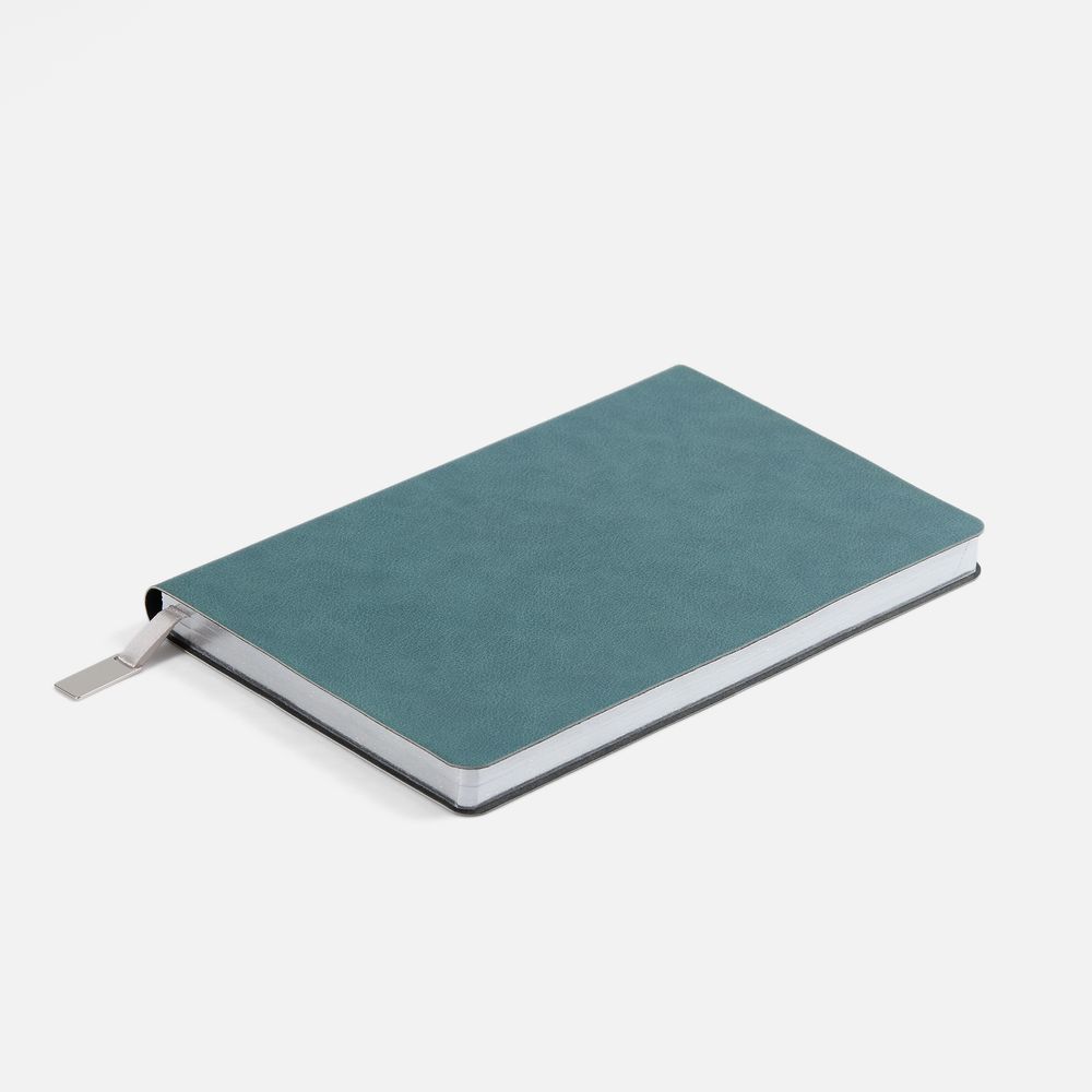 Ежедневник с гибкой обложкой, выполнен из материала Petrus, голубой JJ, дополнен серым ляссе с металлическим шильдиком.