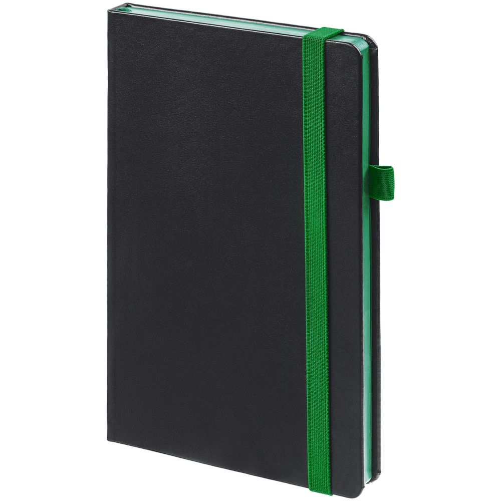 Ежедневник с твердой обложкой, выполнен из материала Waltz, черный АА, дополнен зеленой резинкой и ляссе.