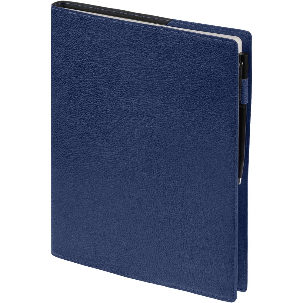 Ежедневник в суперобложке выполнен из материала La Fite, синий НН, дополнен ляссе и капталом черного цвета.