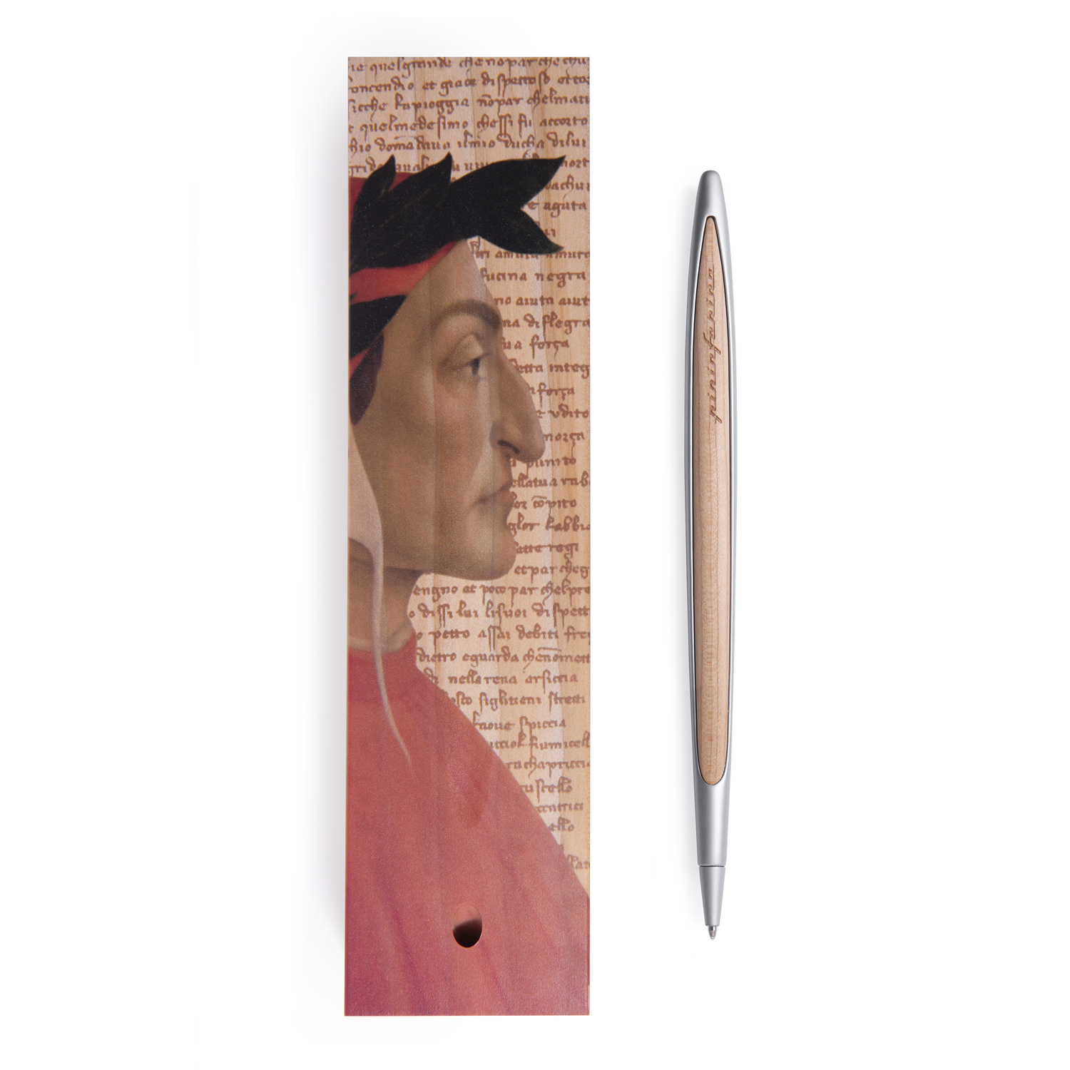 Лимитированная коллекция бренда Pininfarina CAMBIANO BOX EXCLUSIVE DANTE 700TH ANNIVERSARY в память о Данте Алигьере, приуроченная к 700-летию его смерти. На коробке из массива кедра, которая является одновременно настольной подставкой для шариковой ручки Cambiano, изображен культовый портрет великого итальянского поэта, написанный мастером эпохи Возрождения Сандро Боттичелли между 1480 и 1485 годами. Именно этот портрет сделал профиль Данте узнаваемым во всем мире. Корпус ручки выполнен из алюминия с вставками из кедрового дерева. Вес ручки 39 гр, длина 16 см. В ручке используется шариковый стержень CROSS® 8513 с синей пастой. Набор упакован в подарочную коробку.