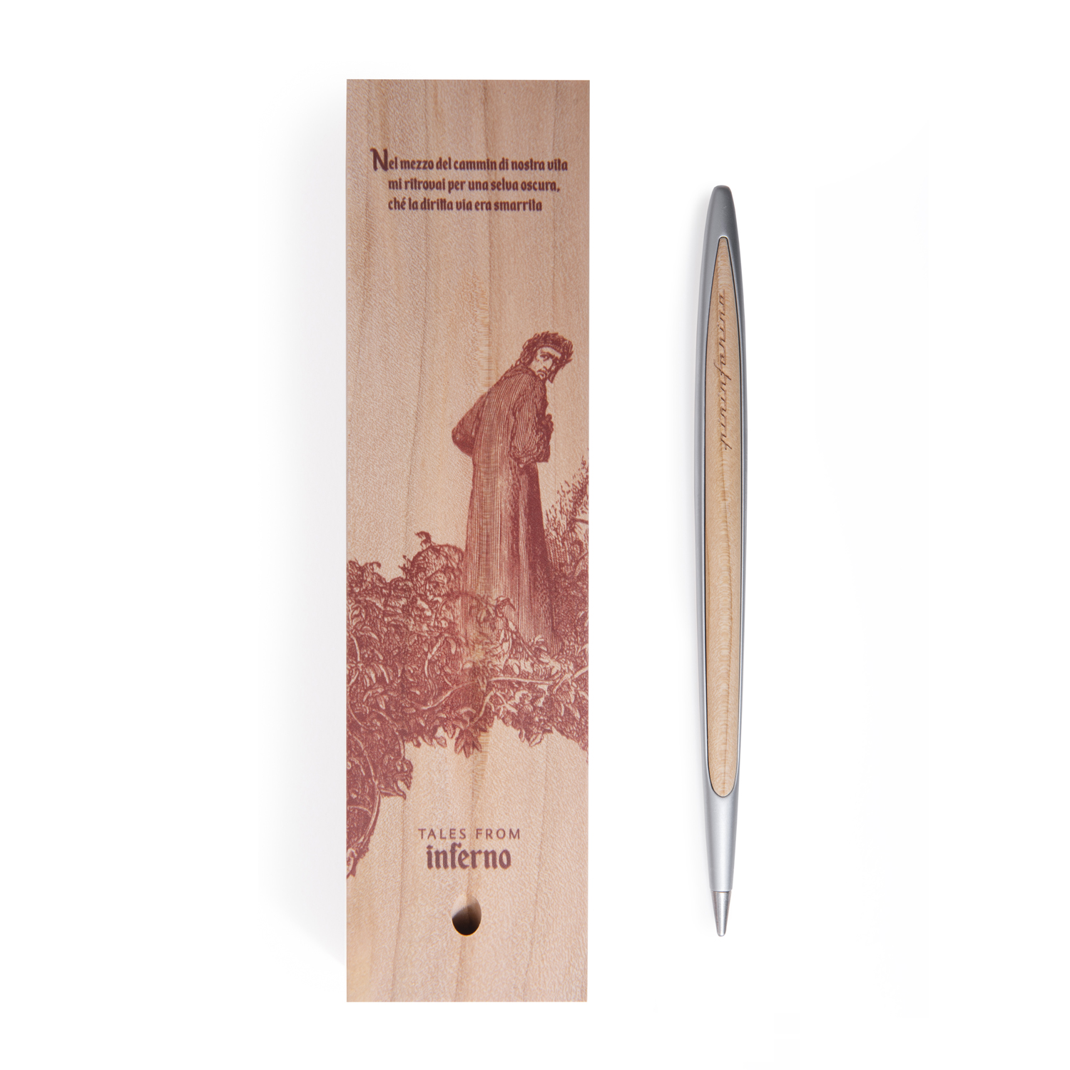 Лимитированная коллекция бренда Pininfarina в память о Данте Алигьере, приуроченная к 700-летию его смерти, с изображениями TALES FROM INFERNO - первой части Ад знаменитой Божественной Комедии. Коробка из массива кедра, которая является одновременно настольной подставкой для вечной ручки Cambiano, с иллюстрацией Гюстава Доре, изображающей темный лес, как аллегорию греха, где заблудился Данте, и где каждый человек может заблудиться на пути своей жизни. Вечная ручка имеет необычный пишущий узел в виде наконечника Ethergraf, который изготовлен из сплава металлов по запатентованной технологии. Он не содержит свинец и алюминий, производится вручную итальянскими мастерами и практически не расходуется за десятилетия использования. При соприкосновении с поверхностью бумаги, происходит химическая реакция и наконечник оставляет серебристый след, который напоминает цвет графитового карандаша, но обладает большей стойкостью. Идеально пишет на каменной бумаге. Корпус ручки выполнен из алюминия с вставками из кедрового дерева. Вес ручки 39 гр, длина 16 см.