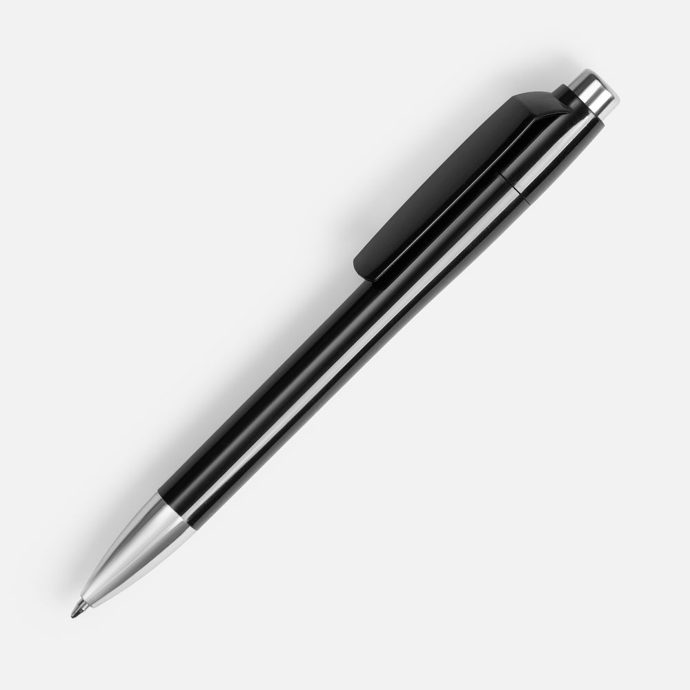 Пластиковая ручка с глянцевым корпусом и хромированными деталями. Большой клип идеален для нанесения логотипа компании.