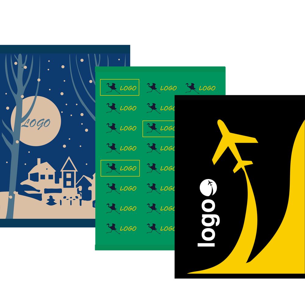 Плед с вывязанным логотипом и индивидуальным рисунком в фирменной цветовой гамме.