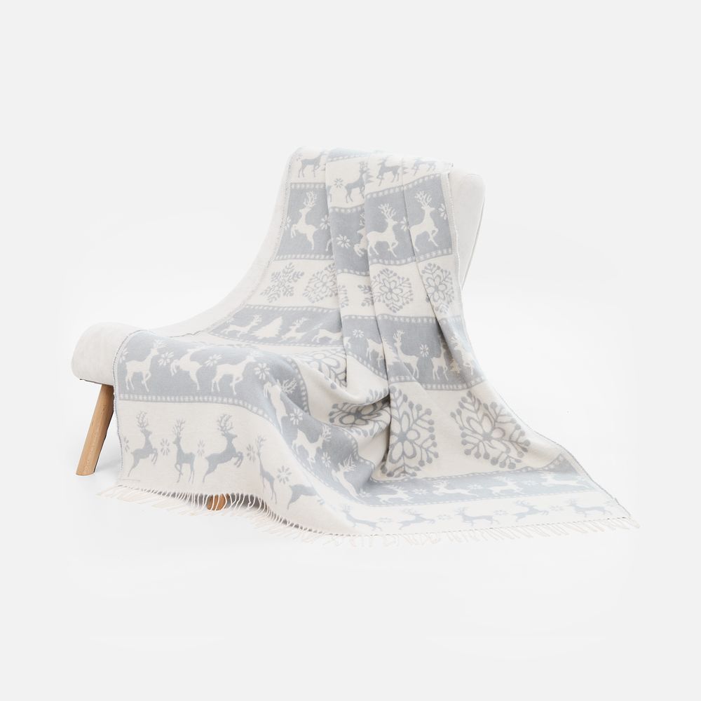 Уникальный жаккардовый рисунок с изображением грациозных оленей и изящных снежинок перенесет в мир северной сказки. Каждая деталь узора тщательно проработана и сразу привлекает внимание, а плед моментально создает неповторимую атмосферу зимнего волшебства.