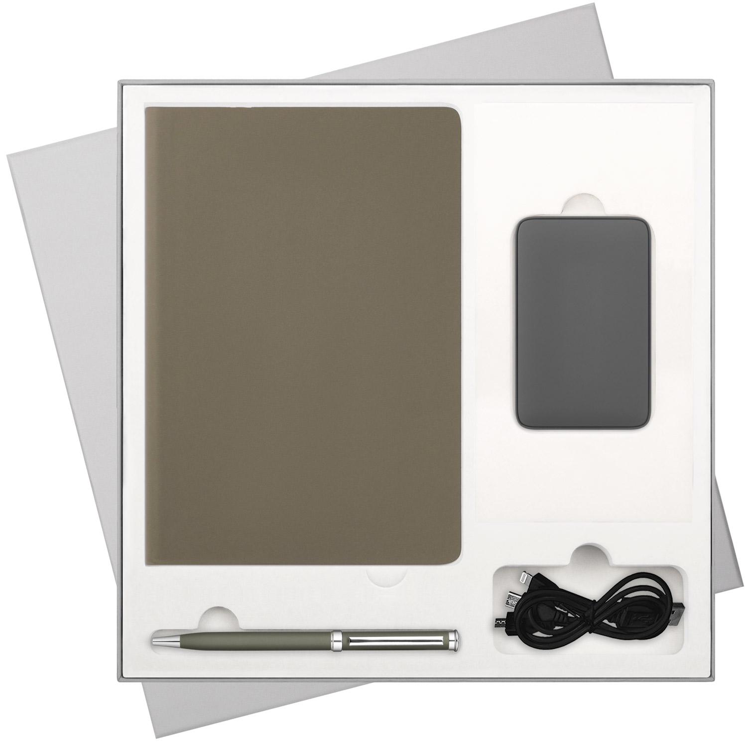В комплекте: стильный ежедневник для планирования и любых записей, ручка для комфортного письма и внешний аккумулятор, который позволит оставаться на связи в любой ситуации.