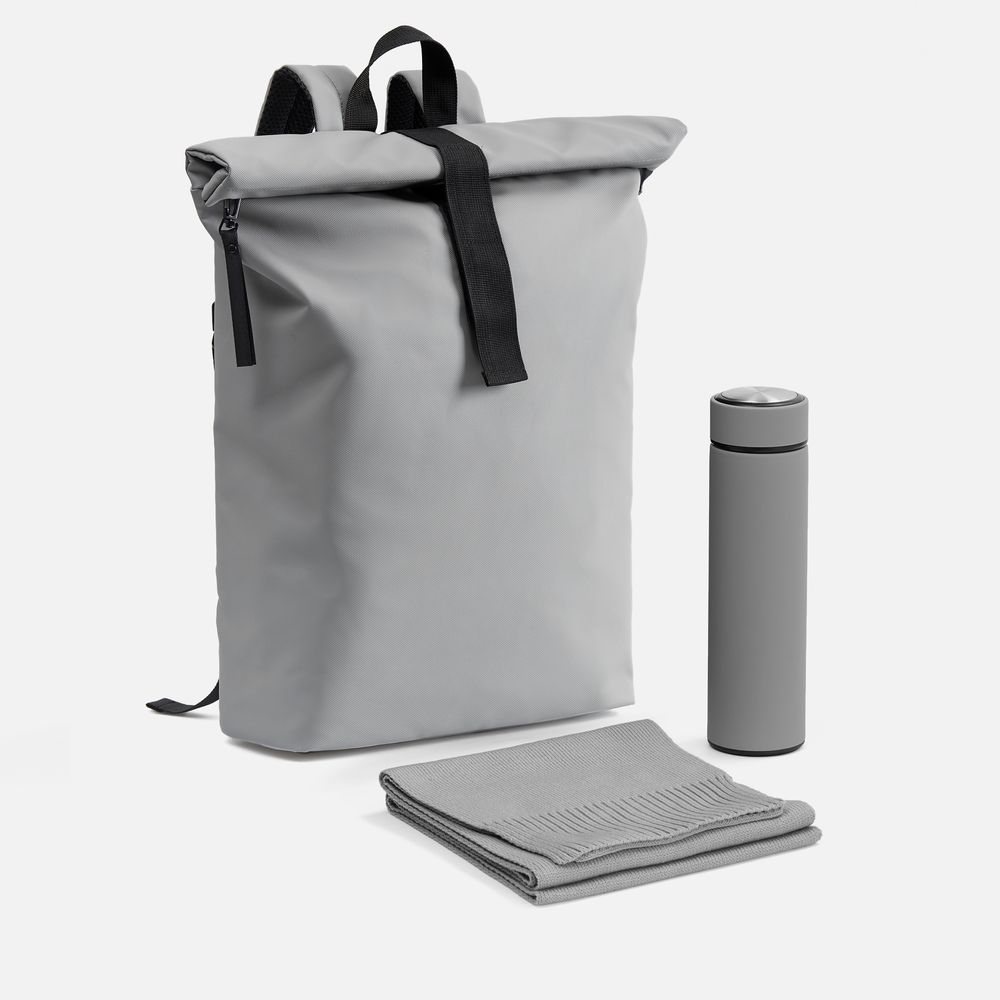 Составляющие набора — шарф и термос — помогут оставаться стильным и, что немаловажно, довольным даже в холодное время года. Модный и практичный рюкзак с удобной регулировкой объема роллтоп всегда подстроится под ситуацию, а потому станет просто незаменим как ежедневно в городе, так и в путешествии.
