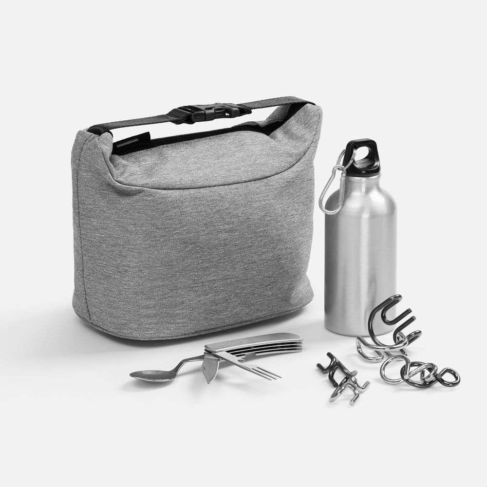 Нержавеющий столовый прибор выручит при желании перекусить вне дома или офиса, термосумка сохранит еду теплой, а прочная алюминиевая бутылка — напиток горячим. Все необходимое всегда под рукой. А чтобы перезагрузить голову, добавлена увлекательная головоломка — источник свежих идей.Емкость бутылки 400 мл.