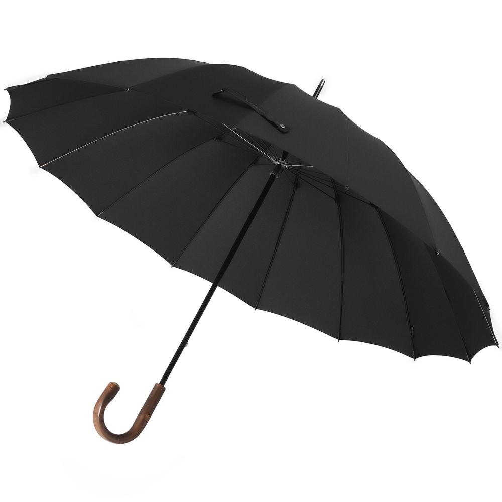 Солидный изысканный зонт с ручкой из дерева и 16 спицами. Большой купол легко укроет от дождя сразу двоих, а надежная конструкция выдержит даже сильный ветер.